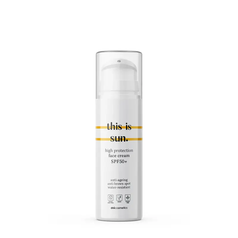 Zonnecrème voor het gelaat met een zeer hoge factor die de huid beschermt tegen UVA en UVB stralen. “this is sun.” face cream SPF50+ is perfect voor alle huidtypes en voor de meest delicate zones zoals je gelaat en decolleté. De crème is verrijkt met een actieve mix van anti-oxidanten en anti-verouderingselementen voor een optimale bescherming en extra hydratatie van de huid. De formule bevat bovendien een specifieke ingrediëntenmix om pigmentvlekken te voorkomen. Het mullein-extract zorgt voor een natuurlijk verhelderend effect op het gelaat. Natriumhyaluronaat werkt vochtinbrengend en vermindert rimpels. Vitamine E beperkt de celschade die de zon aanricht en versterkt de barrièrefunctie van de huid. Rijstzetmeel stimuleert de celvitaliteit en zorgt zo voor een zijdezacht gevoel. Deze face cream SPF50+ laat geen wit laagje achter bij het aanbrengen. Bovendien heeft deze zonnecrème een heerlijk frisse geur op basis van tuberoos, jasmijn en zwarte bessen. “this is sun.” face cream is dermatologisch getest en geschikt voor de gevoelige huid.